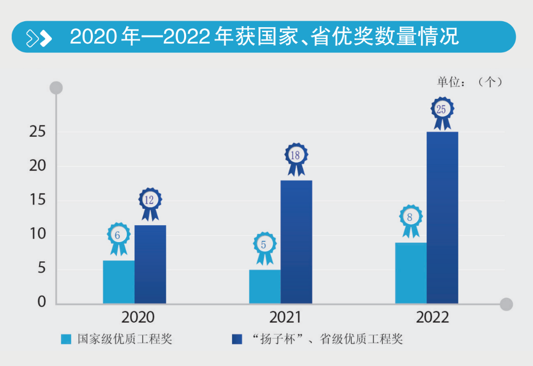 工程創(chuàng)優(yōu)亮點(diǎn)紛呈 兩年多來(lái),我市建筑企業(yè)獲評(píng)國(guó)家級(jí)優(yōu)質(zhì)工程獎(jiǎng)13項(xiàng),提前完成“十四五”目標(biāo)任務(wù);獲評(píng)“揚(yáng)子杯”、省級(jí)優(yōu)質(zhì)工程獎(jiǎng)63項(xiàng),省標(biāo)準(zhǔn)化星級(jí)工地166項(xiàng),建筑工程類(lèi)發(fā)明專(zhuān)利29項(xiàng),國(guó)家級(jí)QC成果17項(xiàng),“鹽阜建筑鐵軍”品牌的知名度和影響力進(jìn)一步擴(kuò)大。