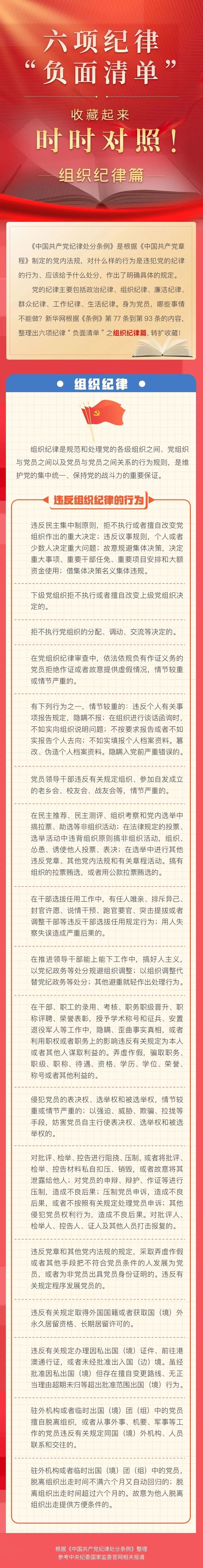 當(dāng)前,全黨正在開展黨紀(jì)學(xué)習(xí)教育。這次黨紀(jì)學(xué)習(xí)教育明確要聚焦解決一些黨員、干部對黨規(guī)黨紀(jì)不上心、不了解、不掌握等問題,組織黨員特別是黨員領(lǐng)導(dǎo)干部認(rèn)真學(xué)習(xí)《中國共產(chǎn)黨紀(jì)律處分條例》,做到學(xué)紀(jì)、知紀(jì)、明紀(jì)、守紀(jì),搞清楚黨的紀(jì)律規(guī)矩是什么,弄明白能干什么、不能干什么,把遵規(guī)守紀(jì)刻印在心,內(nèi)化為言行準(zhǔn)則,進一步強化紀(jì)律意識、加強自我約束、提高免疫能力,增強政治定力、紀(jì)律定力、道德定力、抵腐定力,始終做到忠誠干凈擔(dān)當(dāng)。根據(jù)《條例》內(nèi)容,現(xiàn)整理出六項紀(jì)律“負(fù)面清單”。今天推出“負(fù)面清單”之組織紀(jì)律篇,一起收藏學(xué)習(xí)。