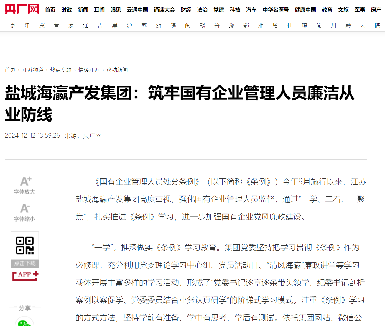 媒體關(guān)注∣鹽城海瀛產(chǎn)發(fā)集團(tuán):“一學(xué)、二看、三聚焦” 做深《國(guó)有企業(yè)管理人員處分條例》學(xué)習(xí) |