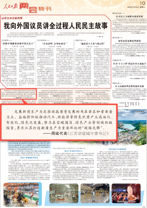 共商國(guó)是、共謀發(fā)展。今年全國(guó)兩會(huì)期間,全國(guó)人大代表、市委書記周斌分別接受《人民日?qǐng)?bào)》《新華每日電訊》《光明日?qǐng)?bào)》《經(jīng)濟(jì)日?qǐng)?bào)》《新華日?qǐng)?bào)》、江蘇省廣播電視總臺(tái)等中央及省主流媒體采訪,深入學(xué)習(xí)習(xí)近平總書記重要講話精神,暢談如何積極策應(yīng)全省“一中心一基地一樞紐”建設(shè),勇當(dāng)全省打造新質(zhì)生產(chǎn)力重要陣地“碳路先鋒”,以實(shí)干實(shí)績(jī)實(shí)效為全省落實(shí)好挑大梁責(zé)任作出新的貢獻(xiàn)。 3月8日全國(guó)人大代表、鹽城市委書記周斌接受《人民日?qǐng)?bào)》采訪