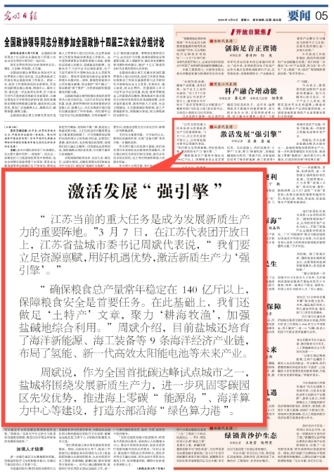 激活發(fā)展“強(qiáng)引擎” “江蘇當(dāng)前的重大任務(wù)是成為發(fā)展新質(zhì)生產(chǎn)力的重要陣地!3月7日,在江蘇代表團(tuán)開放日上,江蘇省鹽城市委書記周斌代表說(shuō),“我們要立足資源稟賦,用好機(jī)遇優(yōu)勢(shì),激活新質(zhì)生產(chǎn)力‘強(qiáng)引擎’! “確保糧食總產(chǎn)量常年穩(wěn)定在140億斤以上,保障糧食安全是首要任務(wù)。在此基礎(chǔ)上,我們還做足‘土特產(chǎn)’文章,聚力‘耕海牧漁’,加強(qiáng)鹽堿地綜合利用!敝鼙蠼榻B,目前鹽城還培育了海洋新能源、海工裝備等9條海洋經(jīng)濟(jì)產(chǎn)業(yè)鏈,布局了氫能、新一代高效太陽(yáng)能電池等未來(lái)產(chǎn)業(yè)。 周斌說(shuō),作為全國(guó)首批碳達(dá)峰試點(diǎn)城市之一,鹽城將圍繞發(fā)展新質(zhì)生產(chǎn)力,進(jìn)一步鞏固零碳園區(qū)先發(fā)優(yōu)勢(shì),推進(jìn)海上零碳“能源島”、海洋算力中心等建設(shè),打造東部沿海“綠色算力港”。
