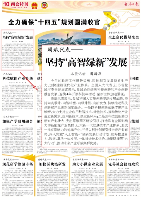 堅(jiān)持“高智綠新”發(fā)展 今年的政府工作報(bào)告提出,因地制宜發(fā)展新質(zhì)生產(chǎn)力,加快建設(shè)現(xiàn)代化產(chǎn)業(yè)體系。全國(guó)人大代表、江蘇省鹽城市委書記周斌表示,鹽城始終聚焦科技創(chuàng)新和產(chǎn)業(yè)創(chuàng)新融合發(fā)展,連續(xù)4年開展科技年活動(dòng),創(chuàng)新主體加速涌現(xiàn)。 周斌代表表示,鹽城將深入實(shí)施創(chuàng)新驅(qū)動(dòng)發(fā)展戰(zhàn)略,堅(jiān)持向高攀升、向智轉(zhuǎn)型、向綠升級(jí)、向新發(fā)力,持續(xù)推動(dòng)科技創(chuàng)新和產(chǎn)業(yè)創(chuàng)新深度融合。一是以科技創(chuàng)新賦能傳統(tǒng)產(chǎn)業(yè)煥新,大力支持企業(yè)應(yīng)用數(shù)智技術(shù)、綠色技術(shù),推動(dòng)傳統(tǒng)產(chǎn)業(yè)適應(yīng)新需求、應(yīng)用新技術(shù)、煥發(fā)新風(fēng)采;二是以科技創(chuàng)新助力新興產(chǎn)業(yè)壯大,突出零碳園區(qū)建設(shè)引領(lǐng),打造具有全國(guó)影響力的新能源產(chǎn)業(yè)集群,壯大新一代信息技術(shù)產(chǎn)業(yè)體系,形成一批有影響力的地標(biāo)產(chǎn)業(yè);三是以科技創(chuàng)新引領(lǐng)未來(lái)產(chǎn)業(yè)布局,深入實(shí)施“人工智能+”創(chuàng)新發(fā)展行動(dòng)計(jì)劃,統(tǒng)籌推進(jìn)算力、數(shù)據(jù)、算法一體發(fā)展,一體推進(jìn)技術(shù)供給、場(chǎng)景賦能等“六大行動(dòng)”,推動(dòng)未來(lái)產(chǎn)業(yè)形成集群優(yōu)勢(shì)。
