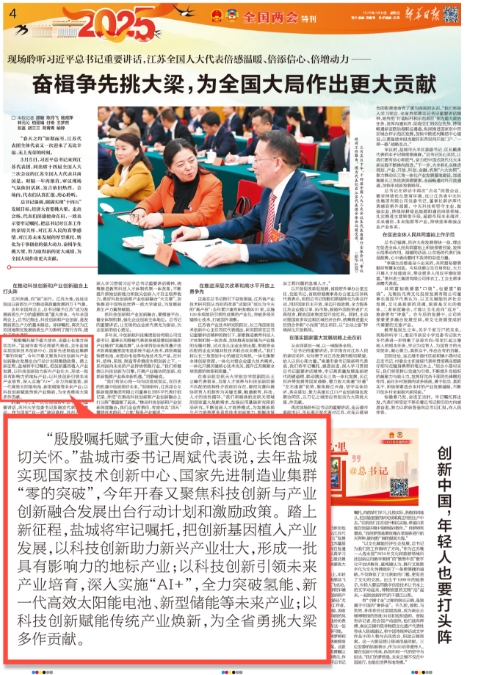 “殷殷囑托賦予重大使命,語(yǔ)重心長(zhǎng)飽含深切關(guān)懷!丙}城市委書記周斌代表說(shuō),去年鹽城實(shí)現(xiàn)國(guó)家技術(shù)創(chuàng)新中心、國(guó)家先進(jìn)制造業(yè)集群“零的突破”,今年開春又聚焦科技創(chuàng)新與產(chǎn)業(yè)創(chuàng)新融合發(fā)展出臺(tái)行動(dòng)計(jì)劃和激勵(lì)政策。踏上新征程,鹽城將牢記囑托,把創(chuàng)新基因植入產(chǎn)業(yè)發(fā)展,以科技創(chuàng)新助力新興產(chǎn)業(yè)壯大,形成一批具有影響力的地標(biāo)產(chǎn)業(yè);以科技創(chuàng)新引領(lǐng)未來(lái)產(chǎn)業(yè)培育,深入實(shí)施“AI+”,全力突破氫能、新一代高效太陽(yáng)能電池、新型儲(chǔ)能等未來(lái)產(chǎn)業(yè);以科技創(chuàng)新賦能傳統(tǒng)產(chǎn)業(yè)煥新,為全省勇挑大梁多作貢獻(xiàn)。