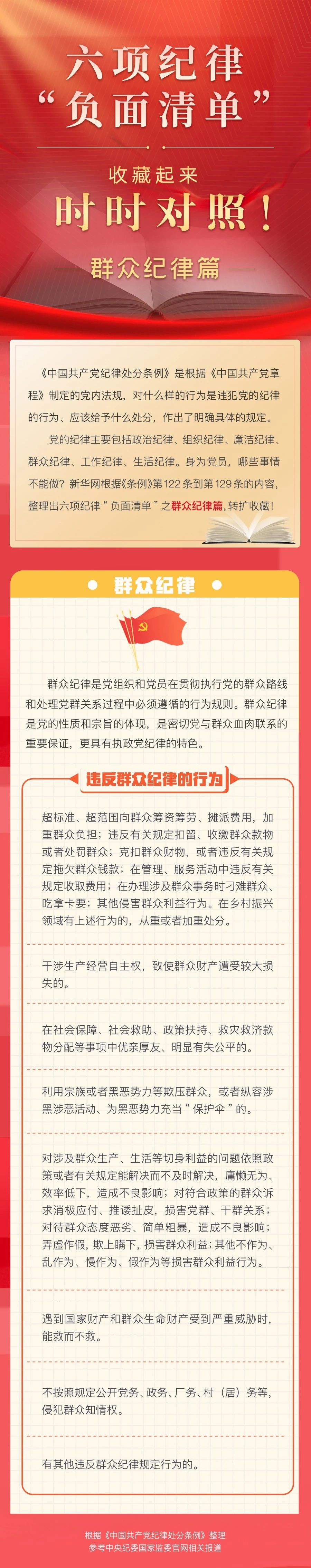 當(dāng)前,全黨正在開展黨紀(jì)學(xué)習(xí)教育。這次黨紀(jì)學(xué)習(xí)教育明確要聚焦解決一些黨員、干部對(duì)黨規(guī)黨紀(jì)不上心、不了解、不掌握等問題,組織黨員特別是黨員領(lǐng)導(dǎo)干部認(rèn)真學(xué)習(xí)《中國共產(chǎn)黨紀(jì)律處分條例》,做到學(xué)紀(jì)、知紀(jì)、明紀(jì)、守紀(jì),搞清楚黨的紀(jì)律規(guī)矩是什么,弄明白能干什么、不能干什么,把遵規(guī)守紀(jì)刻印在心,內(nèi)化為言行準(zhǔn)則,進(jìn)一步強(qiáng)化紀(jì)律意識(shí)、加強(qiáng)自我約束、提高免疫能力,增強(qiáng)政治定力、紀(jì)律定力、道德定力、抵腐定力,始終做到忠誠干凈擔(dān)當(dāng)。本文根據(jù)《條例》內(nèi)容,整理出六項(xiàng)紀(jì)律“負(fù)面清單”。今天推出“負(fù)面清單”之群眾紀(jì)律篇,一起收藏學(xué)習(xí)。